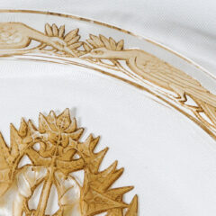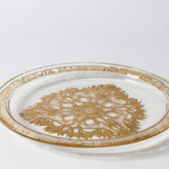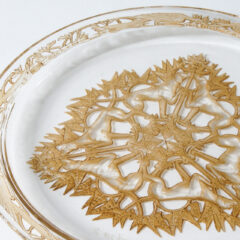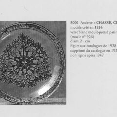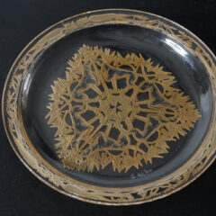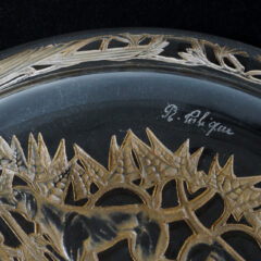 ルネ・ラリックがガラス作家へ転身してまだ間もない時代であったためか、ジュエリー作家時代のアール・ヌーヴォー様式を彷彿とさせる装飾性豊かなデザインです。お皿の裏側に陰刻で凹凸を付け、パチネ彩色によって陰影を描いています。