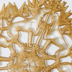 パチネ彩色とは、顔料を塗布した後にあえて拭き取ることでレリーフを際立たせて古ぼけた風合いを出す、ルネ・ラリック独特の古色技法です。猟犬の筋肉や顔の表情まで細やかに描き出しており、非常に写実的な表現となっています。