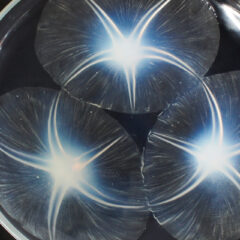 ユニークな形状をした鉢で、朝顔の花が3つ寄り添うようにデザインされ、3本それぞれの花芯が下まで伸びた3脚鉢の仕上がりとなっています。オパルセントガラスの色味と器型のせいもあってか、どこか浮遊感のある涼しげな印象です。