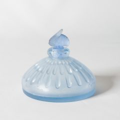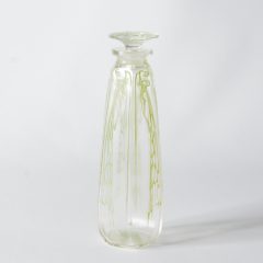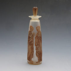 しばらく状態の良い個体の出会いがなく、久しぶりの入荷です。コンディション非常に良く、オリジナルのパチネ彩色も綺麗に残っています。古代の「龍涎香(りゅうぜんこう)」を意味する名前のコティ社のオリジナル香水のためにデザインされた作品。香水に芸術的イメージを与えるために、古代ローマの衣装をまとった女性像をあしらい、新古典調のデザインに仕上げてある。花束を手にした人物は、それぞれポーズが異なる。ラリック作品群においてはかなり初期にデザインされた作品で、アール・ヌーヴォーらしい優雅なデザイン。アンブル(英アンバー)は「琥珀(こはく)」という意味もあり、水溶性の顔料による表面着色(パチネ)で琥珀色に仕上げられている。細長いシルエットに刀の鍔(つば)のような幅広の口縁の付いたこの形は、古代の香油瓶によく見受けられる。コティ社の中ではかなり人気のあった香水瓶で、