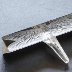 モチーフである「トンボ」が陰刻でデザインされており、セピア色のパチネによる彩色は細密なデザインの輪郭を浮かび上がらせ、作品の魅力をよりいっそう高めている。