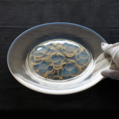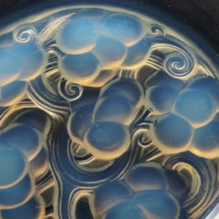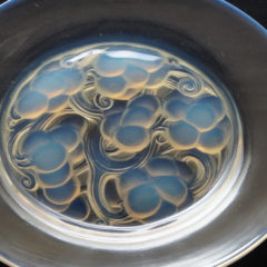 ラリックが1927年にデザインを手がけたマリエンタール ''MARIENTHAL''のお皿が入荷しました。プレス成型で器見込み部分で大胆に葡萄が描かれたラリックならではのデザイン。ガラスの濃い部分にはオパルセントの沈殿が美しく、器の淵周りにもオパルセントの発色が綺麗に出ており、浮遊感のある仕上がり。フランスのアルザス地方にある小さな村の名が由来になっており、ドイツ語でいうとマリアの谷という意味合いを持ちます。アルザス地方最古のマリア聖地として巡礼地にもなっています。