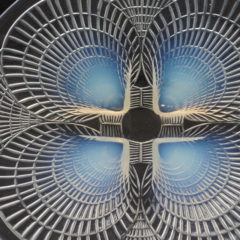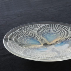 貝殻を象った「コキール」のお皿。ラリックが好んで用いたオパルセントガラスは、自然光では青白く、透過光ではオレンジに見える、光によって色を変える不思議なガラスです。「コキール」のお皿は5段階のサイズが作られましたが、こちらは2番目に小さなサイズです。