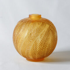 ローリエ(月桂樹)をモチーフにした筒形花瓶。ローリエは煮込み料理に使われるブーケ・ガルニ(香草をブーケ状に束ねたもの)などに使われ、フランスでは馴染み深いモチーフであります。作品タイトルにあるPorte-pinceauxとは筆立てのような筒形形状を指します。当時のラリック社からは相当数の花瓶がリリースされていますが、Porte-pinceauxと称される花瓶はこの1種しかなく、珍しい個体です。