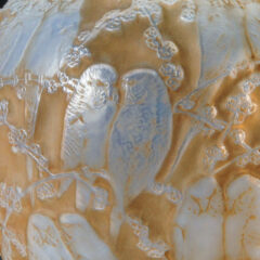 ラリックの代表作として非常によく知られたデザインです。オパルセントガラスのグラデーションによってインコの姿が幻想的に表現されています。