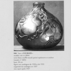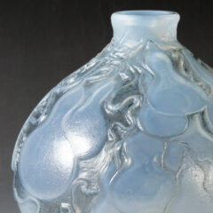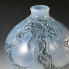1914年にリリースされた花瓶「ひょうたん」。読んで字の如くとでも言いましょうか、ひょうたん型の花瓶にひょうたんがデザインされたラリックらしいユニークな作品。写実的に描写されたモチーフはアール・ヌーヴォー様式の名残を感じさせます。クリアガラスに型吹き成型で作成された花瓶で、クリア仕上げととフロスト加工のコンビネーションが美しく、フロストを施した部分にパチネ彩色を施しているため綺麗に陰影が出ています。グレーパチネが相まってどこかメタリックな印象すらある仕上がりです。バリエーションとしては当時クリアガラス、色ガラス、オパルセントガラスで作成されていたモデルです。